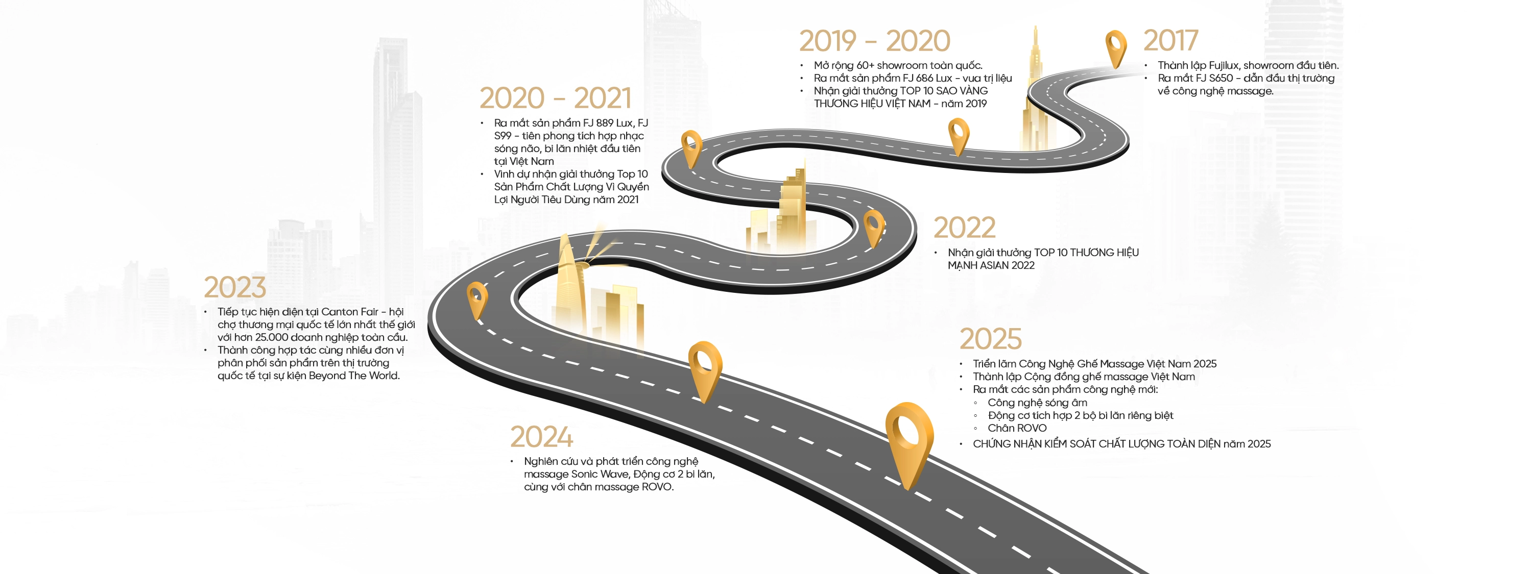 Năm 2017 đánh dấu cột mốc quan trọng khi Fujilux chính thức thành lập và khai trương showroom đầu tiên. Đây là bước đi tiên phong để giới thiệu đến người tiêu dùng Việt Nam một trải nghiệm hoàn toàn mới mẻ trong lĩnh vực ghế massage.