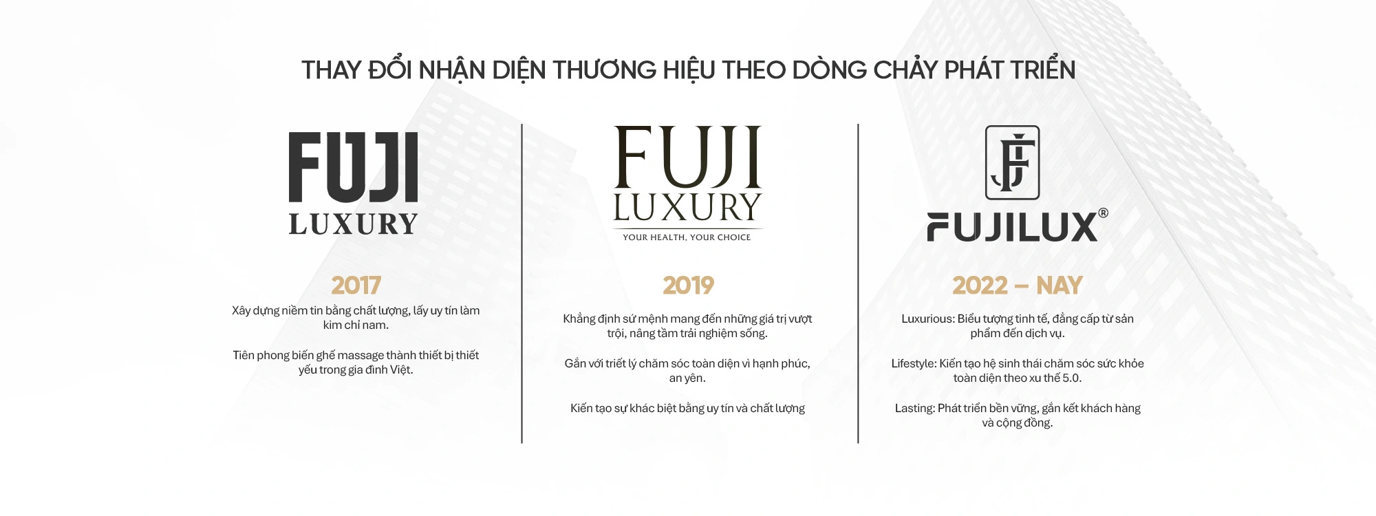 Trên hành trình phát triển, Fujilux đã nhiều lần nâng tầm nhận diện thương hiệu, khoác lên mình diện mạo hiện đại, thời thượng và phù hợp với định hướng phát triển quốc tế, nhưng vẫn giữ vững nét sang trọng và tinh hoa đẳng cấp.