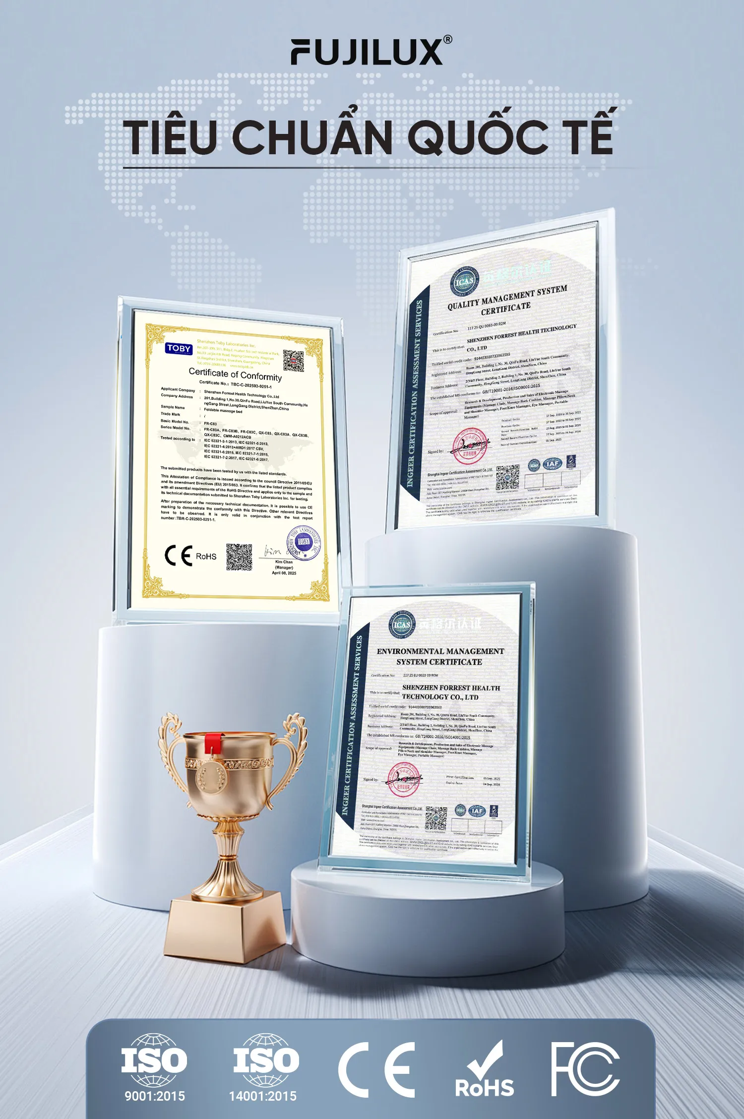 Các sản phẩm của FujiLux được sản xuất theo quy trình nghiêm ngặt, khắng định chất lượng vượt trội và an toàn với các chứng nhận CE, ROHS đảm bảo tính an toàn và hiệu quả của sản phẩm. FujiLux cam kết mang tới sản phẩm chất lượng và sự an tâm tâm tuyệt đối cho Quý khách hàng trên toàn thế giới.