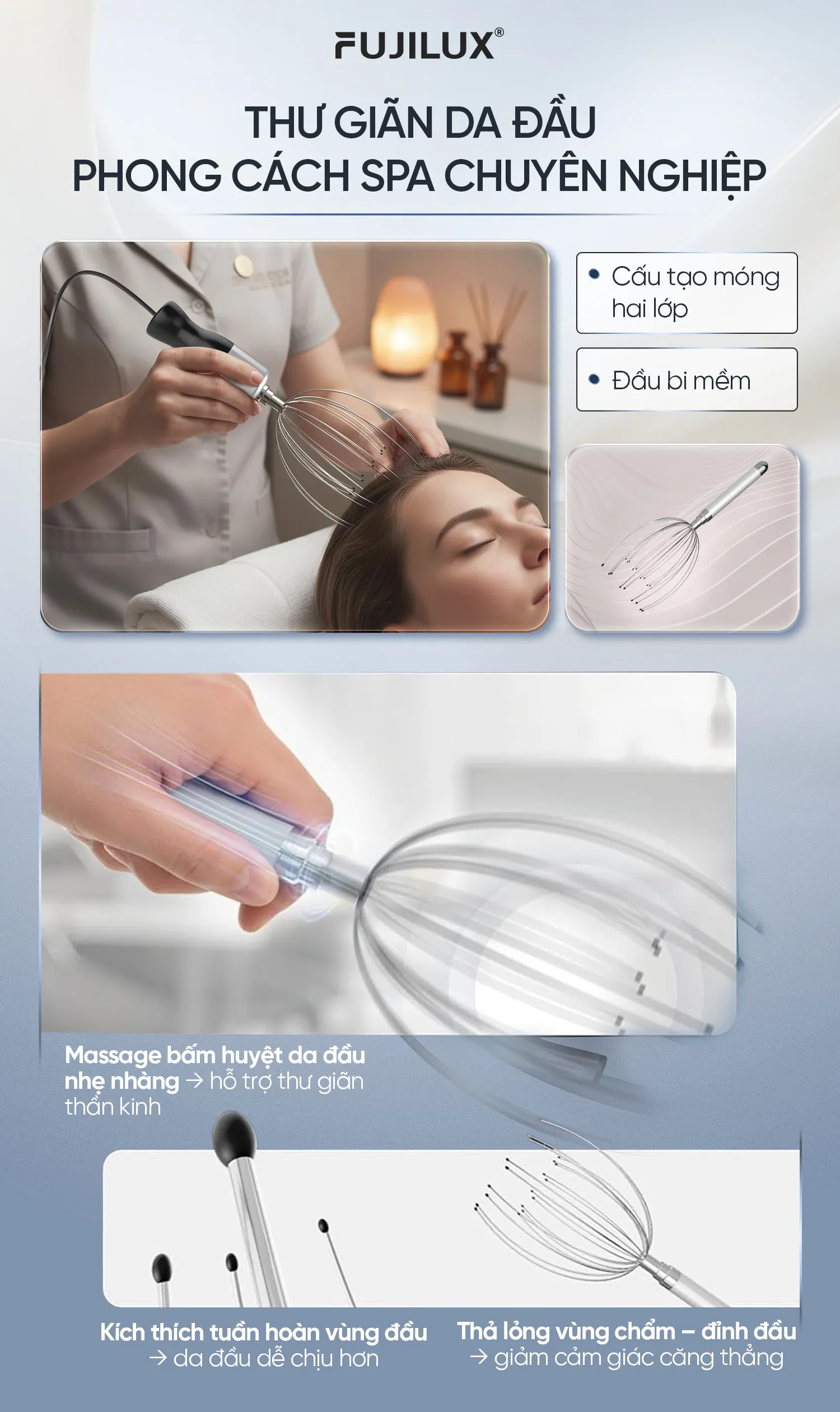 Máy massage đầu MN200 giúp cải thiện quá trình tuần hoàn máu, cung cấp oxy và dưỡng chất lên não bộ, giúp tinh thần tỉnh táo.